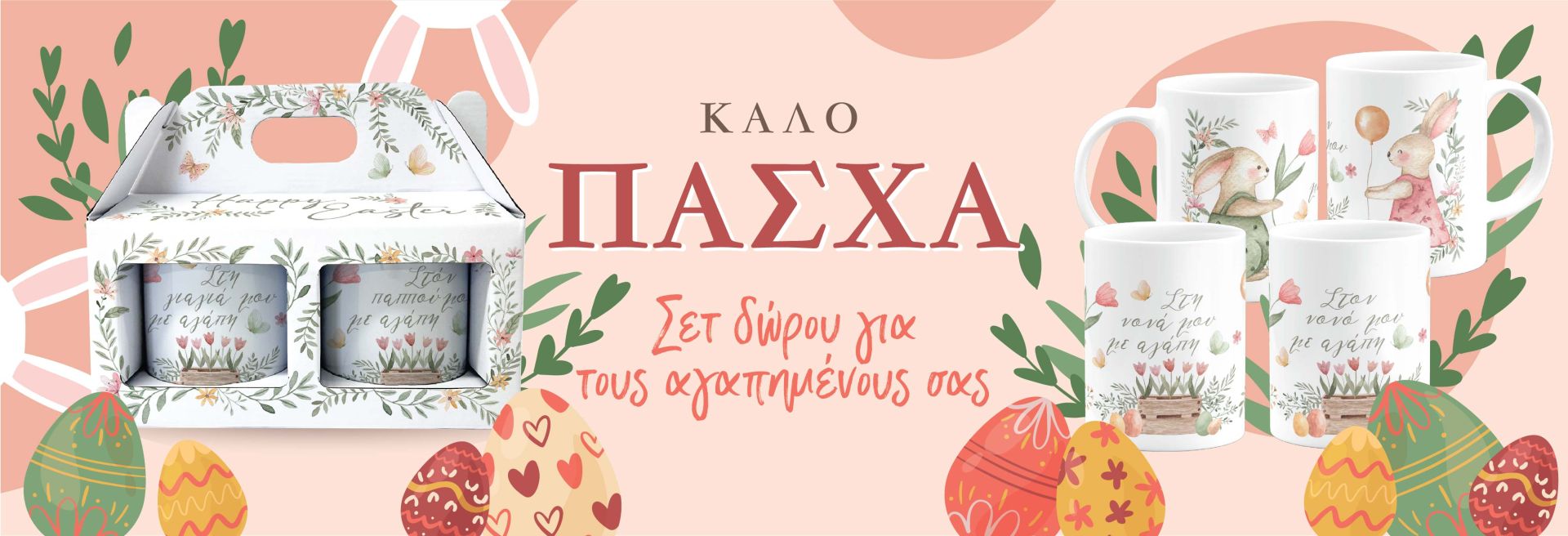 Κομψό σετ δώρου με συσκευασία ΚΜ10 και δύο εκτυπωμένες κούπες. Ιδανική επιλογή για πασχαλινά δώρα, με προσεγμένο σχεδιασμό και δυνατότητα εξατομίκευσης.